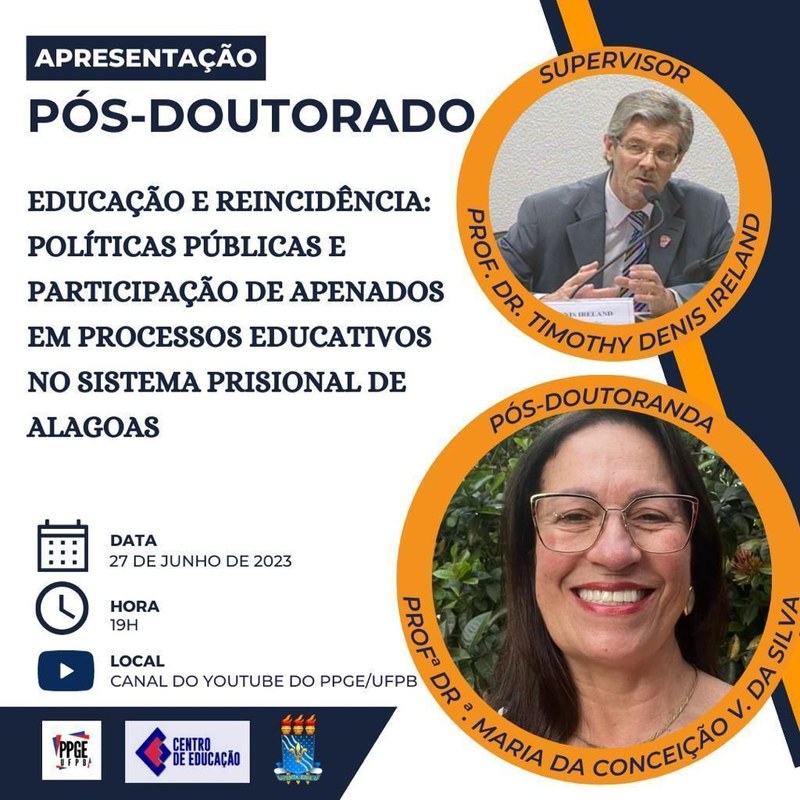Informamos que dia 27.06, às 19:00 teremos apresentação do Relatório da Pesquisa intitulado: EDUCAÇÃO E REINCIDÊNCIA: POLÍTICAS PÚBLICAS E PARTICIPAÇÃO DE APENADOS EM PROCESSOS EDUCATIVOS NO SISTEMA PRISIONAL DE ALAGOAS, referente ao pós-doutorado em Educação pelo Programa de Pós-graduação em Educação da Universidade Federal da Paraíba, da Profa. Conceição Valença. A transmissão será no canal do Youtube do PPGE da UFPB.